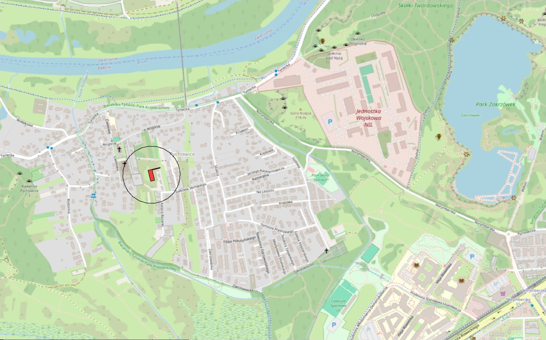 od zachodu lasem i Górką Pychowicką wchodzącymi w skład Bielańsko-Tynieckiego Parku Krajobrazowego.